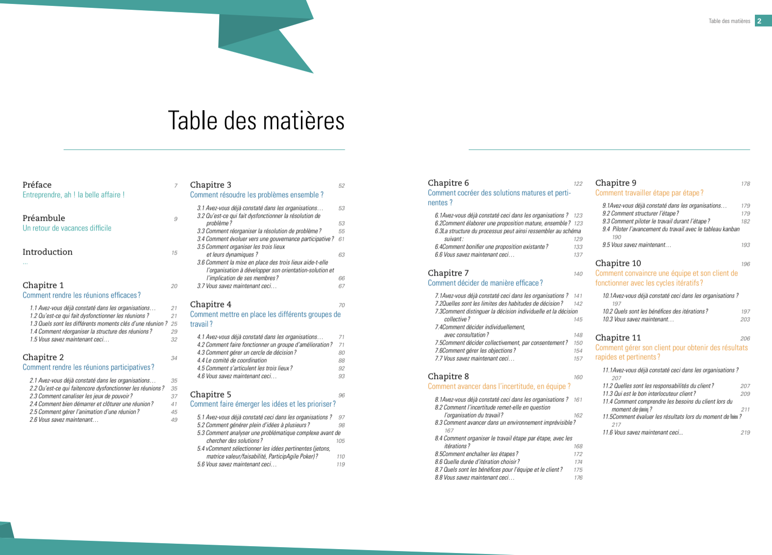 Cet ouvrage est un trésor, à la fois sur le fond et la forme. Sans doute le meilleur travail de synthèse que j’ai pu lire sur la dynamique participative en entreprise et l’agilité organisationnelle. Sur la forme d’abord, c’est un livre hyper structuré et structurant, aéré, sérieux et drôle à la fois grâce aux multiples anecdotes et aux illustrations qui rendent la lecture légère voire même addictive.